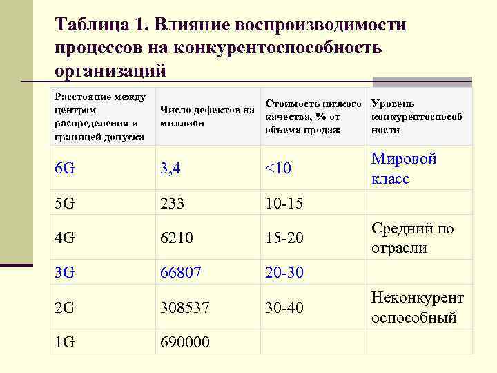 Таблица 1. Влияние воспроизводимости процессов на конкурентоспособность организаций Расстояние между центром распределения и границей допуска Стоимость низкого Уровень Число дефектов на качества, % от конкурентоспособ миллион объема продаж ности 6 G 3, 4 <10 5 G 233 10 -15 4 G 6210 15 -20 3 G 66807 20 -30 2 G 308537 30 -40 1 G 690000 Мировой класс Средний по отрасли Неконкурент оспособный