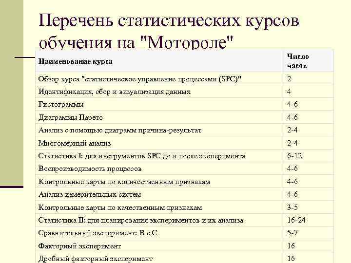 Перечень статистических курсов обучения на "Мотороле" Наименование курса Число часов Обзор курса "статистическое управление процессами (SPC)" 2 Идентификация, сбор и визуализация данных 4 Гистограммы 4 -6 Диаграммы Парето 4 -6 Анализ с помощью диаграмм причина-результат 2 -4 Многомерный анализ 2 -4 Статистика I: для инструментов SPC до и после эксперимента 6 -12 Воспроизводимость процессов 4 -6 Kонтрольные карты по количественным признакам 4 -6 Анализ измерительных систем 4 -6 Kонтрольные карты по качественным признакам 3 -5 Статистика II: для планирования экспериментов и их анализа 16 -24 Сравнительный эксперимент: B с С 5 -7 Факторный эксперимент 16 Дробный факторный эксперимент 16