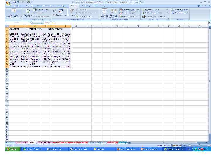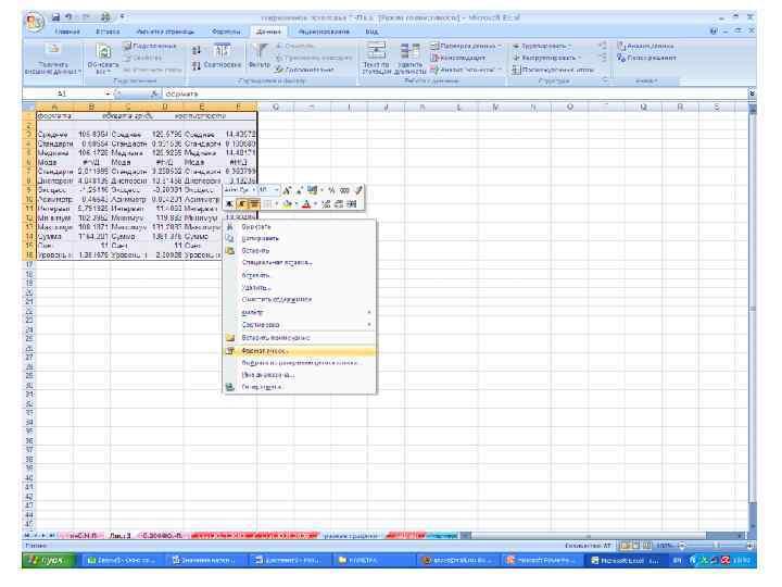 Формируем таблицу с данными, которые необходимо статистически обработать. Далее выбираем вкладку Данные/Анализ данных/Описательная статистика.