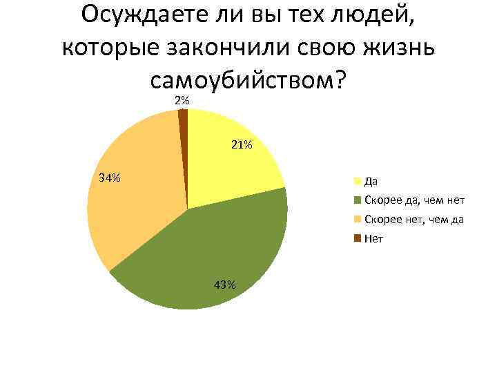 Осуждаете ли вы тех людей, которые закончили свою жизнь самоубийством? 2% 21% 34% Да Скорее да, чем нет Скорее нет, чем да Нет 43%