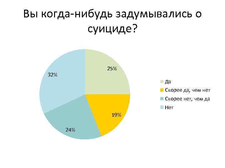 Вы когда-нибудь задумывались о суициде? 25% 32% Да Скорее да, чем нет Скорее нет, чем да Нет 19% 24%