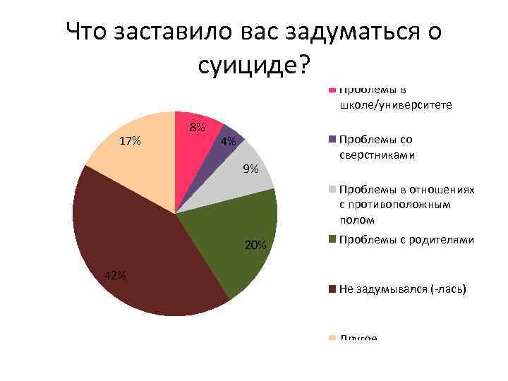 Что заставило вас задуматься о суициде? Проблемы в школе/университете 17% 8% 4% 9% Проблемы со сверстниками Проблемы в отношениях с противоположным полом 20% 42% Проблемы с родителями Не задумывался (-лась) Другое
