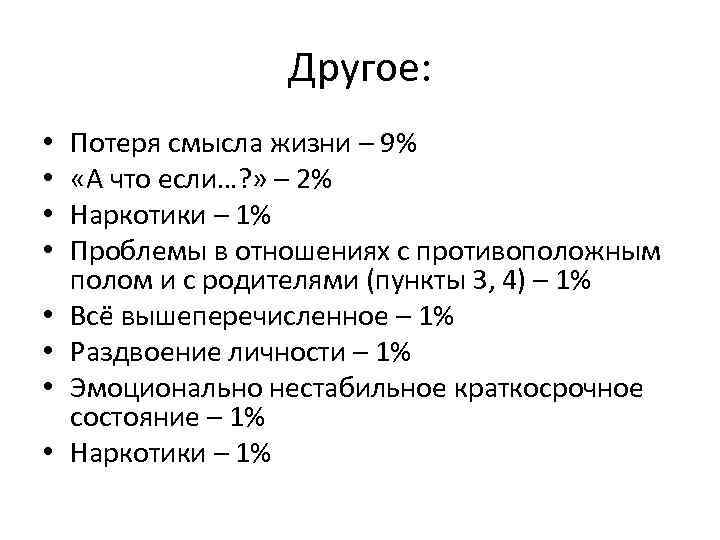 Другое: • • Потеря смысла жизни – 9% «А что если…? » – 2% Наркотики – 1% Проблемы в отношениях с противоположным полом и с родителями (пункты 3, 4) – 1% Всё вышеперечисленное – 1% Раздвоение личности – 1% Эмоционально нестабильное краткосрочное состояние – 1% Наркотики – 1%