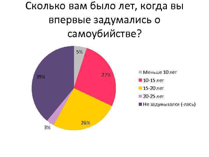 Сколько вам было лет, когда вы впервые задумались о самоубийстве? 5% 27% 39% Меньше 10 лет 10 -15 лет 15 -20 лет 20 -25 лет Не задумывался (-лась) 3% 26%