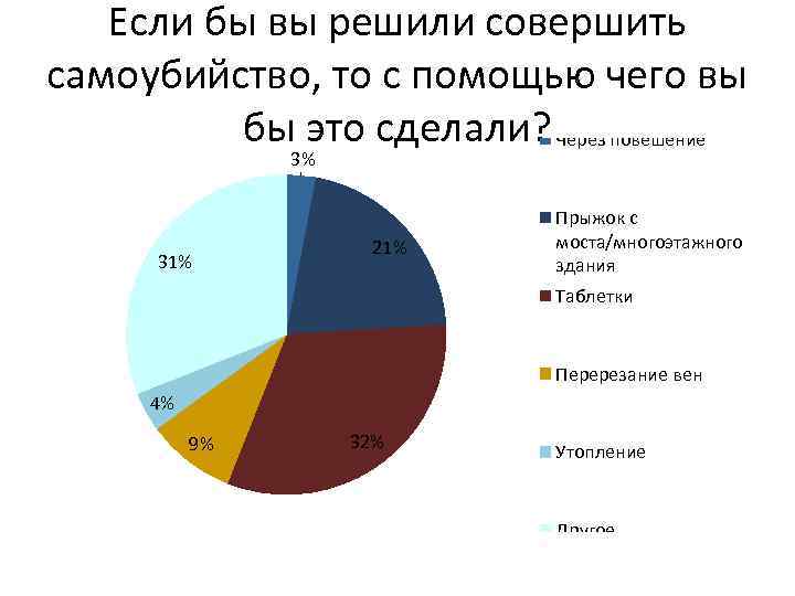 Если бы вы решили совершить самоубийство, то с помощью чего вы бы это сделали? Через повешение 3% 31% 21% Прыжок с моста/многоэтажного здания Таблетки Перерезание вен 4% 9% 32% Утопление Другое