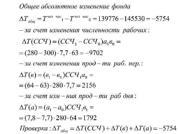 3. 10. По предприятию имеются следующие данные за два периода: Показатели Среднее списочное число рабочих Отработано рабочими, чел -дн. Отработано рабочими, чел -час. Базисный период Отчетный период 300 280 18 900 17 920 145 530 139 776 Определите изменение общего количества отработанного времени (в чел-часах) за счет различных факторов. Проанализируйте динамику показателей использования рабочего времени (средней фактической продолжительности рабочего периода в днях и часах, средней фактической продолжительности рабочего дня).