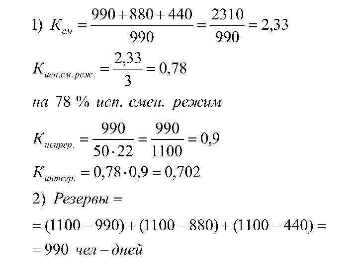 3. 12. За месяц по цеху число отработанных чел-дней составило: в первой смене – 990; во второй – 880; в третьей – 440. Число рабочих мест в цехе – 50, число рабочих дней в месяце – 22. Определите: 1) коэффициенты сменности, использования сменного режима, непрерывности и интегральный коэффициент использования рабочих мест; 2) резервы рабочего времени из-за неполного использования рабочих мест; 3) прирост объема продукции, который можно получить в результате повышения эффективности использования рабочих мест, если коэффициент сменности рабочих увеличить до 2, 5 (средняя выработка продукции за смену одним рабочим составляет 220 рублей).