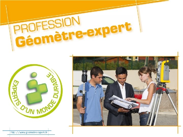 LA PROFESSION Создание ордена Закон n° 46 -942 от 7 мая 1946, учреждающий Орден геометров-экспертов Статья 1 – 1° Геометр-эксперт осуществляет исследование и топографические работы, устанавливающие границы земельных владений и, в этом качестве, составляет в различных масштабах и в любой форме топографические планы и документы , касающиеся определения прав на данную собственность, такие как: планы раздела, деления, продажи и обмена недвижимым имуществом, планы границ земельного участка. Статья 1 – 2° Геометр-эксперт осуществляет исследование, готовит топографические, технические, географические документы по поручению властей и частных лиц, касательно благоустройству территории, осуществляет любые технические операции и исследования по оценке, управлению и оснащению земельных владений. Статья 2 Работы, предусмотренные в 1° могут выполняться только геометрамиэкспертами, являющимися членами ордена.