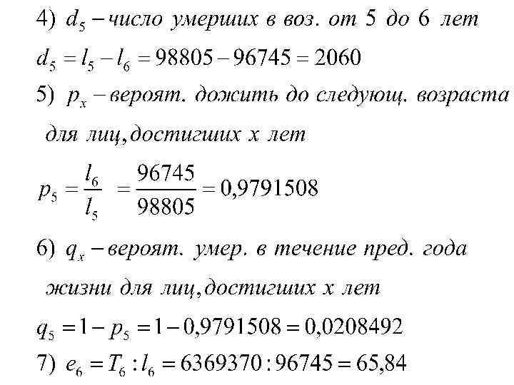 1. 26. Имеются следующие данные: • число человеко-лет предстоящей жизни от возрасте 5 лет и до предельного возраста - 6 467 145 • среднее число живущих в возрасте 5 лет - 97 775 • число доживающих до 5 лет - 98 805. Заполните строку таблицы смертности для возраста 5 лет. Определите среднюю продолжительность предстоящей жизни для лиц, достигших возраста 6 лет.