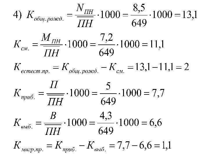 1. 17. На начало года имеются следующие данные по населенному пункту, тыс. чел. : наличное население - 650; временно проживающие - 6, временно отсутствующие - 4. В течение года произошли следующие изменения (тыс. чел. ): родилось всего 9, в том числе у постоянных жителей - 8, 5; умерло всего - 8, в том числе у постоянных жителей - 7, 2; прибыло на постоянное жительство - 5, выехало на постоянное жительство (из числа постоянных жителей) - 4, 3. Численность временно проживающих на конец года уменьшилась на 1, 6 тыс. чел. , а численность временно отсутствующих увеличилась на 1, 5 тыс. чел. Определить: 1) численность постоянного населения на начало и конец года; 2) численность наличного населения на конец года; 3) среднегодовую численность постоянного населения; 4) показатели естественного и миграционного движения постоянного населения.