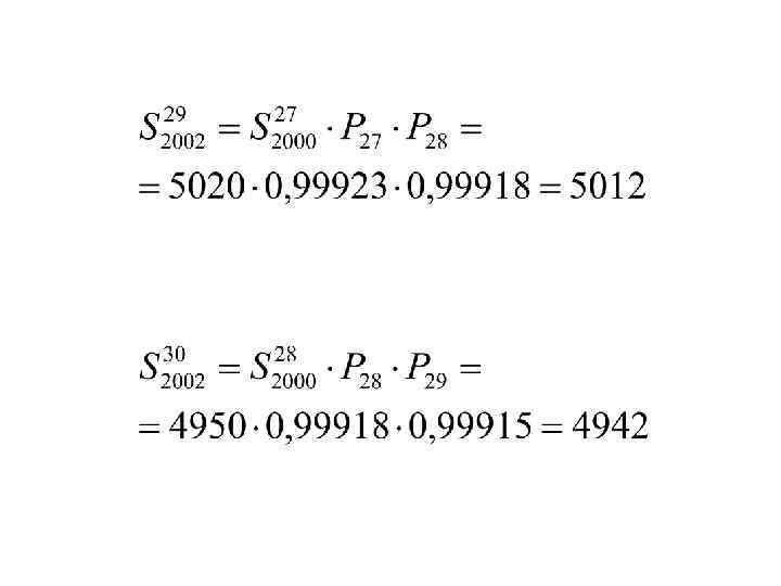 1. 25. Имеются следующие данные о численности мужчин на 01. 00 г. в населенном пункте и коэффициенты дожития (из таблиц смертности и средней продолжительности жизни). Возраст, лет Число мужчин Коэффициент дожития 25 3260 0, 99928 26 4080 0, 99925 27 5020 0, 99923 28 4950 0, 99918 29 4722 0, 99915 Определите ожидаемую численность мужчин в возрасте 29 и 30 лет на 01. 2002 г. без учета миграции.