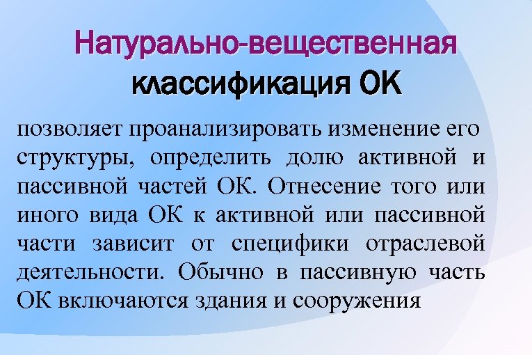 Натурально-вещественная классификация ОК позволяет проанализировать изменение его структуры, определить долю активной и пассивной частей ОК. Отнесение того или иного вида ОК к активной или пассивной части зависит от специфики отраслевой деятельности. Обычно в пассивную часть ОК включаются здания и сооружения