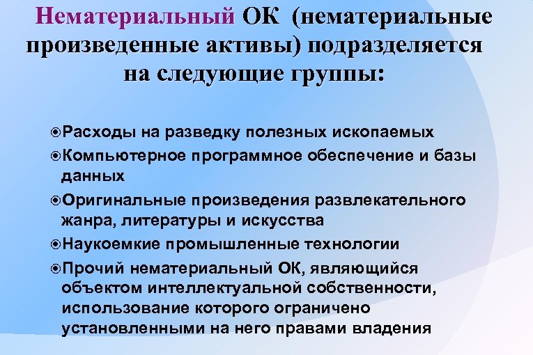Нематериальный ОК (нематериальные произведенные активы) подразделяется на следующие группы: Расходы на разведку полезных ископаемых Компьютерное программное обеспечение и базы данных Оригинальные произведения развлекательного жанра, литературы и искусства Наукоемкие промышленные технологии Прочий нематериальный ОК, являющийся объектом интеллектуальной собственности, использование которого ограничено установленными на него правами владения