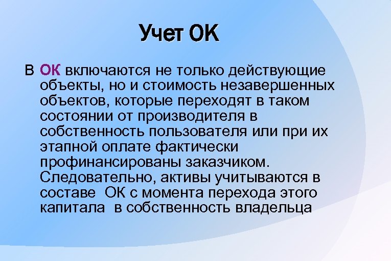 Учет ОК В ОК включаются не только действующие объекты, но и стоимость незавершенных объектов, которые переходят в таком состоянии от производителя в собственность пользователя или при их этапной оплате фактически профинансированы заказчиком. Следовательно, активы учитываются в составе ОК с момента перехода этого капитала в собственность владельца