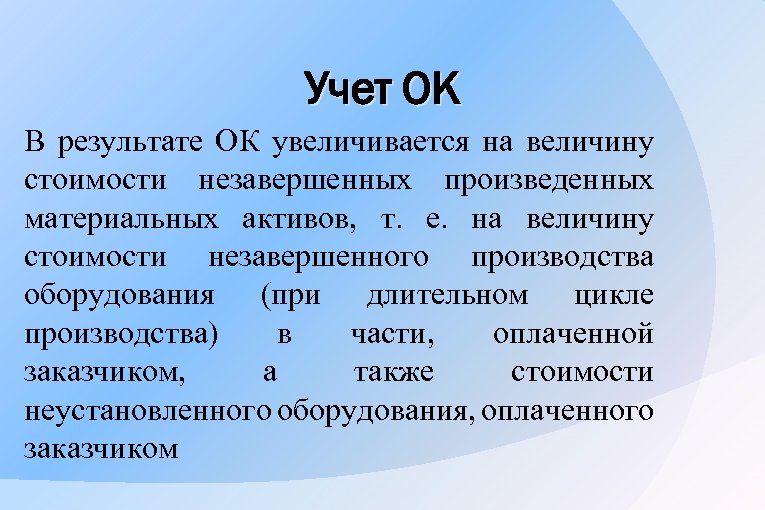 Учет ОК В результате ОК увеличивается на величину стоимости незавершенных произведенных материальных активов, т. е. на величину стоимости незавершенного производства оборудования (при длительном цикле производства) в части, оплаченной заказчиком, а также стоимости неустановленного оборудования, оплаченного заказчиком