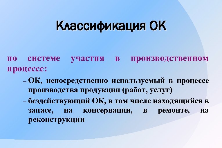 Классификация ОК по системе процессе: участия в производственном – ОК, непосредственно используемый в процессе производства продукции (работ, услуг) – бездействующий ОК, в том числе находящийся в запасе, на консервации, в ремонте, на реконструкции