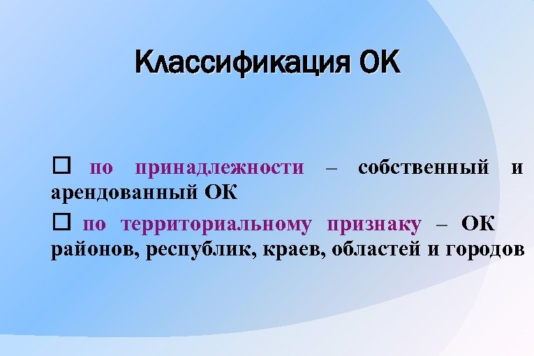 Классификация ОК по принадлежности – собственный и арендованный ОК по территориальному признаку – ОК районов, республик, краев, областей и городов