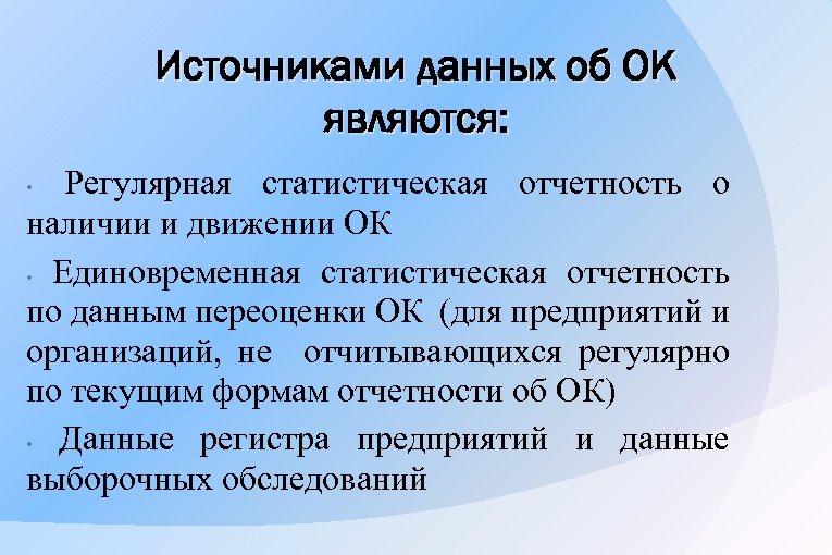 Источниками данных об ОК являются: Регулярная статистическая отчетность о наличии и движении ОК • Единовременная статистическая отчетность по данным переоценки ОК (для предприятий и организаций, не отчитывающихся регулярно по текущим формам отчетности об ОК) • Данные регистра предприятий и данные выборочных обследований •