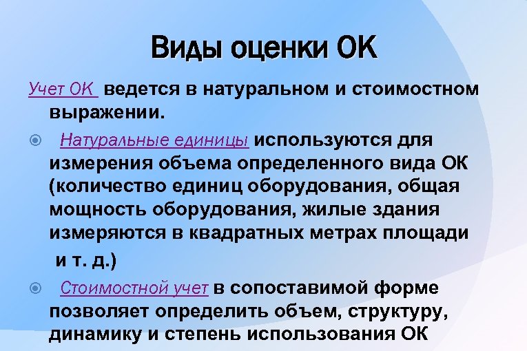 Виды оценки ОК Учет ОК ведется в натуральном и стоимостном выражении. Натуральные единицы используются для измерения объема определенного вида ОК (количество единиц оборудования, общая мощность оборудования, жилые здания измеряются в квадратных метрах площади и т. д. ) Стоимостной учет в сопоставимой форме позволяет определить объем, структуру, динамику и степень использования ОК