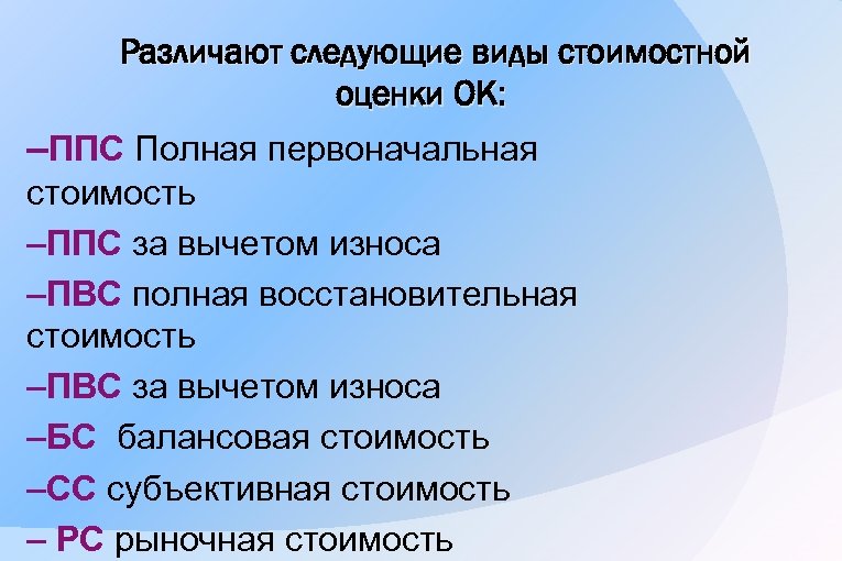 Различают следующие виды стоимостной оценки ОК: –ППС Полная первоначальная стоимость –ППС за вычетом износа –ПВС полная восстановительная стоимость –ПВС за вычетом износа –БС балансовая стоимость –СС субъективная стоимость – РС рыночная стоимость