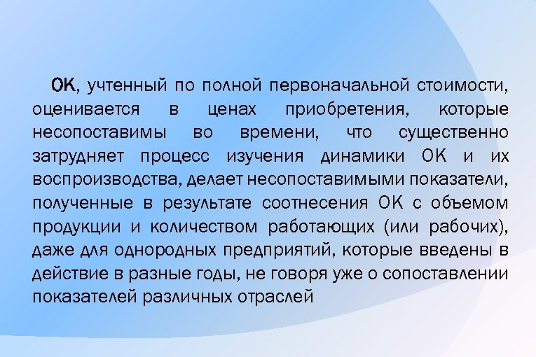 ОK, учтенный по полной первоначальной стоимости, оценивается в ценах приобретения, которые несопоставимы во времени, что существенно затрудняет процесс изучения динамики OK и их воспроизводства, делает несопоставимыми показатели, полученные в результате соотнесения ОК с объемом продукции и количеством работающих (или рабочих), даже для однородных предприятий, которые введены в действие в разные годы, не говоря уже о сопоставлении показателей различных отраслей