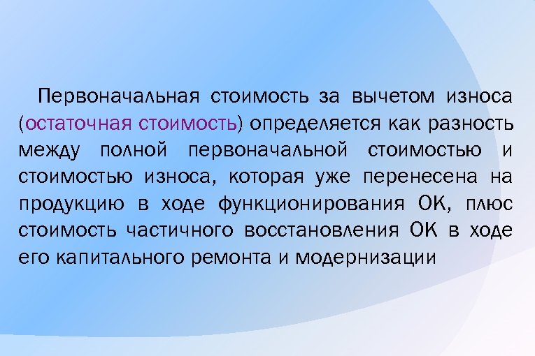 Первоначальная стоимость за вычетом износа (остаточная стоимость) определяется как разность между полной первоначальной стоимостью износа, которая уже перенесена на продукцию в ходе функционирования ОК, плюс стоимость частичного восстановления ОК в ходе его капитального ремонта и модернизации