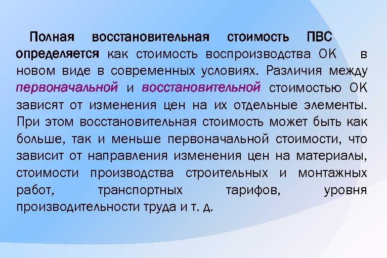 Полная восстановительная стоимость ПВС определяется как стоимость воспроизводства ОК в новом виде в современных условиях. Различия между первоначальной и восстановительной стоимостью ОК зависят от изменения цен на их отдельные элементы. При этом восстановительная стоимость может быть как больше, так и меньше первоначальной стоимости, что зависит от направления изменения цен на материалы, стоимости производства строительных и монтажных работ, транспортных тарифов, уровня производительности труда и т. д.