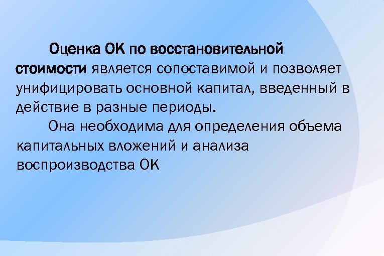 Оценка ОК по восстановительной стоимости является сопоставимой и позволяет унифицировать основной капитал, введенный в действие в разные периоды. Она необходима для определения объема капитальных вложений и анализа воспроизводства ОК