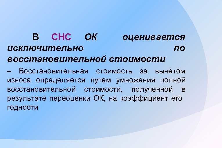 В СНС ОК оценивается исключительно по восстановительной стоимости – Восстановительная стоимость за вычетом износа определяется путем умножения полной восстановительной стоимости, полученной в результате переоценки ОК, на коэффициент его годности