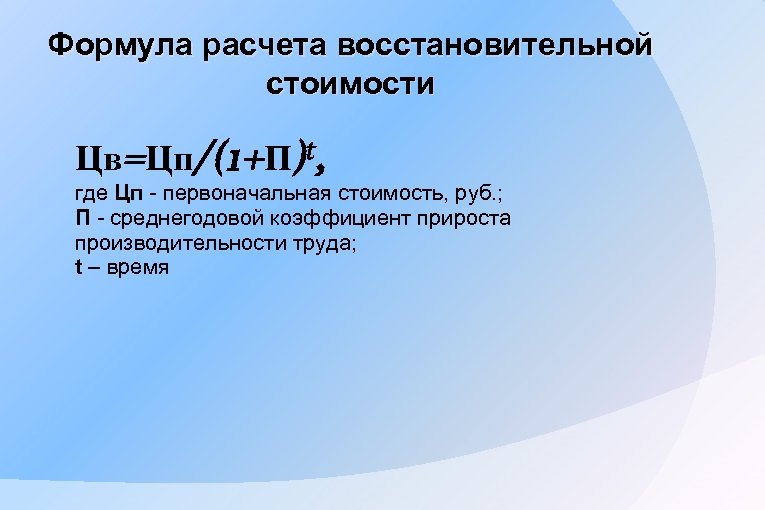 Формула расчета восстановительной стоимости Цв=Цп/(1+П)t, где Цп - первоначальная стоимость, руб. ; П - среднегодовой коэффициент прироста производительности труда; t – время