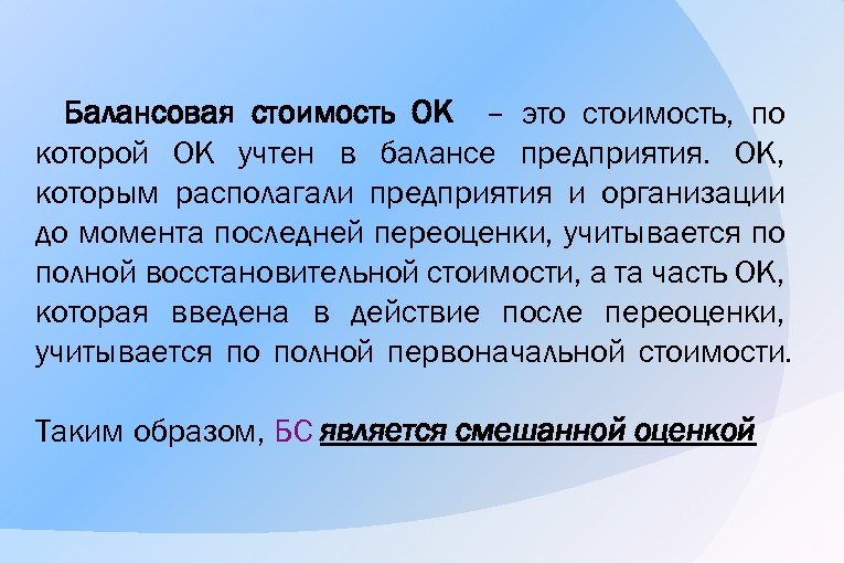 Балансовая стоимость ОК – это стоимость, по которой ОК учтен в балансе предприятия. ОК, которым располагали предприятия и организации до момента последней переоценки, учитывается по полной восстановительной стоимости, а та часть ОК, которая введена в действие после переоценки, учитывается по полной первоначальной стоимости. Таким образом, БС является смешанной оценкой