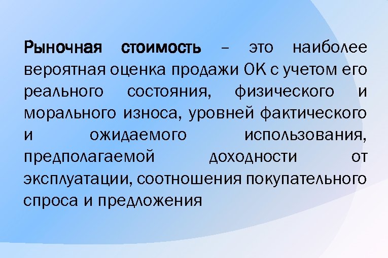 Рыночная стоимость – это наиболее вероятная оценка продажи ОК с учетом его реального состояния, физического и морального износа, уровней фактического и ожидаемого использования, предполагаемой доходности от эксплуатации, соотношения покупательного спроса и предложения