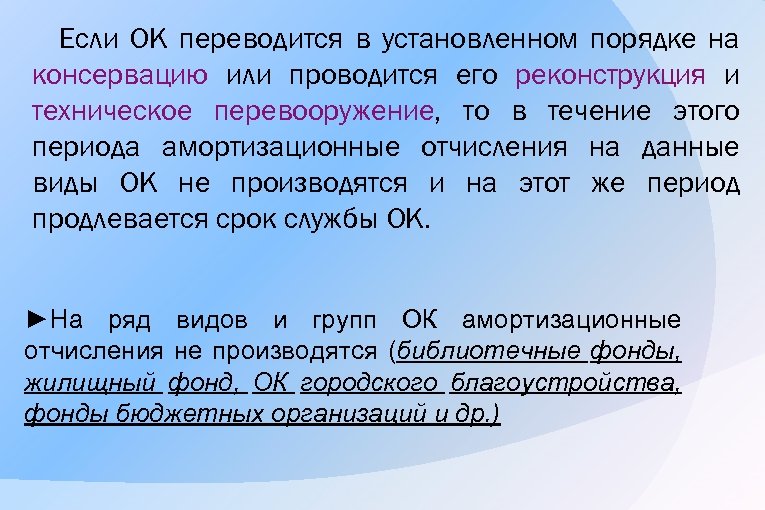 Если ОК переводится в установленном порядке на консервацию или проводится его реконструкция и техническое перевооружение, то в течение этого периода амортизационные отчисления на данные виды ОК не производятся и на этот же период продлевается срок службы ОК. ►На ряд видов и групп ОК амортизационные отчисления не производятся (библиотечные фонды, жилищный фонд, ОК городского благоустройства, фонды бюджетных организаций и др. )