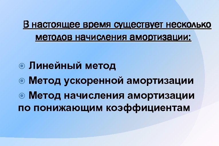 В настоящее время существует несколько методов начисления амортизации: Линейный метод Метод ускоренной амортизации Метод начисления амортизации по понижающим коэффициентам