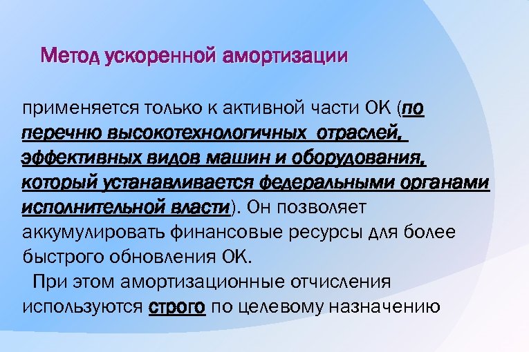 Метод ускоренной амортизации применяется только к активной части ОК (по перечню высокотехнологичных отраслей, эффективных видов машин и оборудования, который устанавливается федеральными органами исполнительной власти). Он позволяет аккумулировать финансовые ресурсы для более быстрого обновления ОК. При этом амортизационные отчисления используются строго по целевому назначению