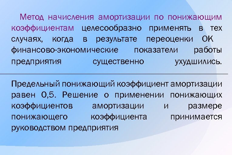 Метод начисления амортизации по понижающим коэффициентам целесообразно применять в тех случаях, когда в результате переоценки ОК финансово-экономические показатели работы предприятия существенно ухудшились. Предельный понижающий коэффициент амортизации равен 0, 5. Решение о применении понижающих коэффициентов амортизации и размере понижающего коэффициента принимается руководством предприятия