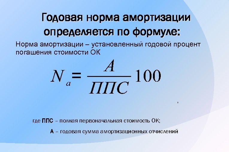Годовая норма амортизации определяется по формуле: Норма амортизации – установленный годовой процент погашения стоимости ОК , где ППС – полная первоначальная стоимость OК; А – годовая сумма амортизационных отчислений