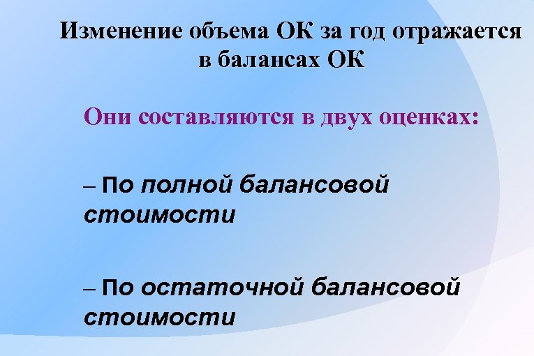 Изменение объема ОК за год отражается в балансах ОК Они составляются в двух оценках: – По полной балансовой стоимости – По остаточной балансовой стоимости