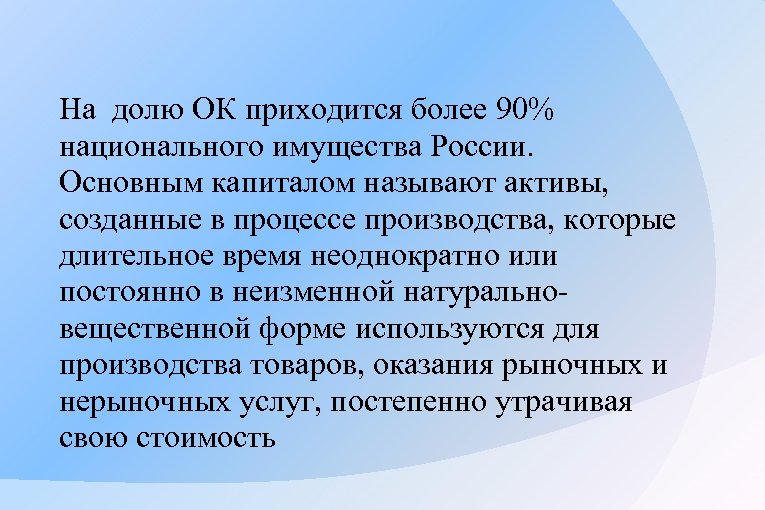 На долю ОК приходится более 90% национального имущества России. Основным капиталом называют активы, созданные в процессе производства, которые длительное время неоднократно или постоянно в неизменной натуральновещественной форме используются для производства товаров, оказания рыночных и нерыночных услуг, постепенно утрачивая свою стоимость