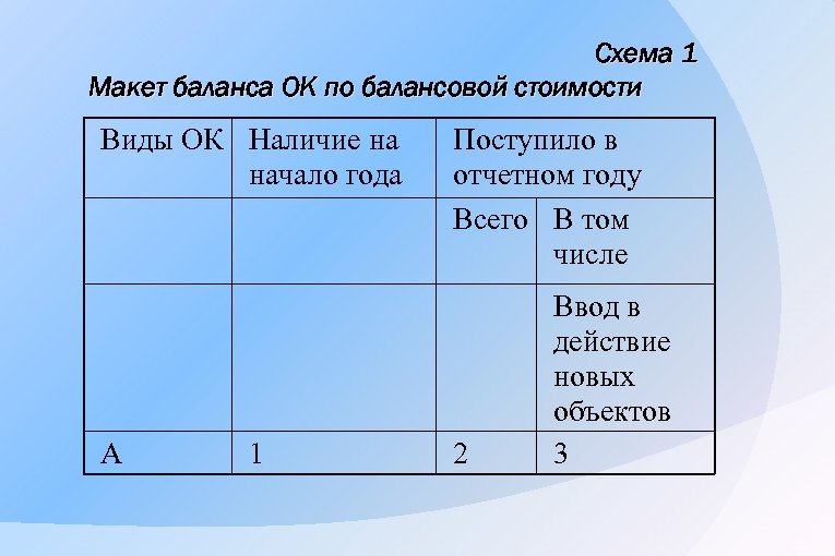 Схема 1 Макет баланса OK по балансовой стоимости Виды ОК Наличие на начало года А 1 Поступило в отчетном году Всего В том числе 2 Ввод в действие новых объектов 3
