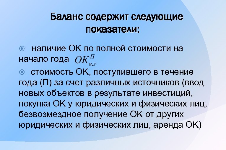 Баланс содержит следующие показатели: наличие OK по полной стоимости на начало года стоимость OK, поступившего в течение года (П) за счет различных источников (ввод новых объектов в результате инвестиций, покупка OK у юридических и физических лиц, безвозмездное получение OK от других юридических и физических лиц, аренда OK)
