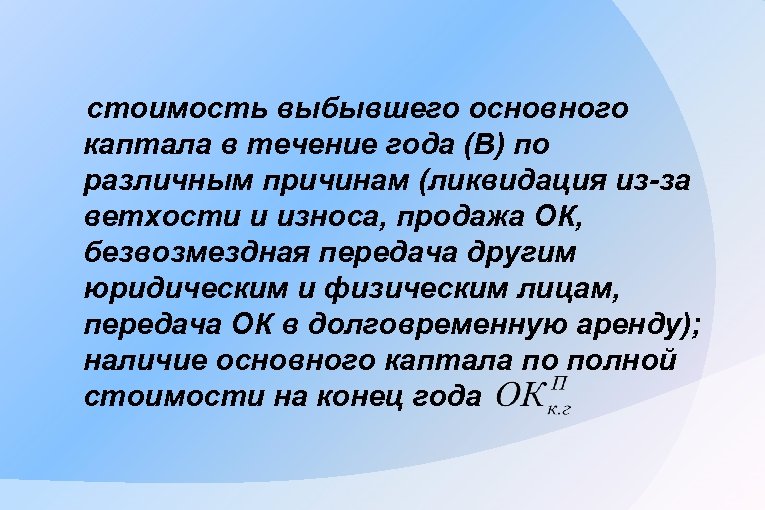 стоимость выбывшего основного каптала в течение года (В) по различным причинам (ликвидация из-за ветхости и износа, продажа ОК, безвозмездная передача другим юридическим и физическим лицам, передача ОК в долговременную аренду); наличие основного каптала по полной стоимости на конец года