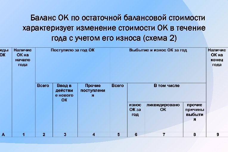 Баланс ОК по остаточной балансовой стоимости характеризует изменение стоимости ОК в течение года с учетом его износа (схема 2)