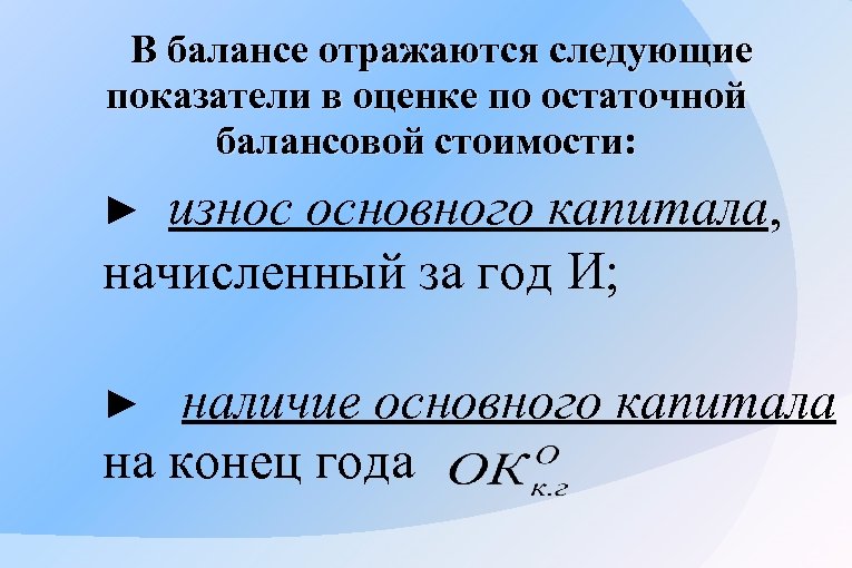 В балансе отражаются следующие показатели в оценке по остаточной балансовой стоимости: износ основного капитала, начисленный за год И; ► наличие основного капитала на конец года ►