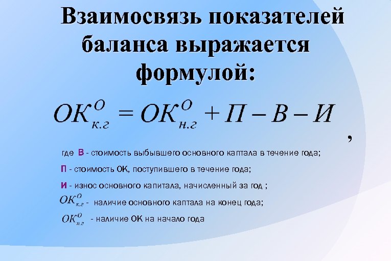 Взаимосвязь показателей баланса выражается формулой: , где В - стоимость выбывшего основного каптала в течение года; П - стоимость OK, поступившего в течение года; И - износ основного капитала, начисленный за год ; - наличие основного каптала на конец года; - наличие OK на начало года