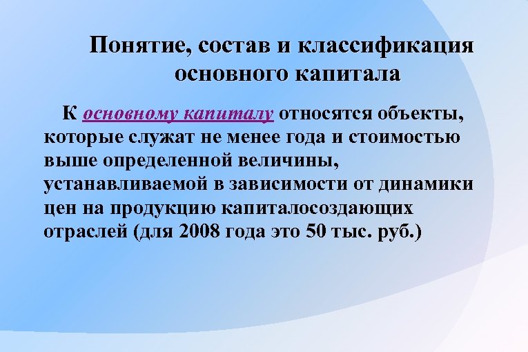 Понятие, состав и классификация основного капитала К основному капиталу относятся объекты, которые служат не менее года и стоимостью выше определенной величины, устанавливаемой в зависимости от динамики цен на продукцию капиталосоздающих отраслей (для 2008 года это 50 тыс. руб. )