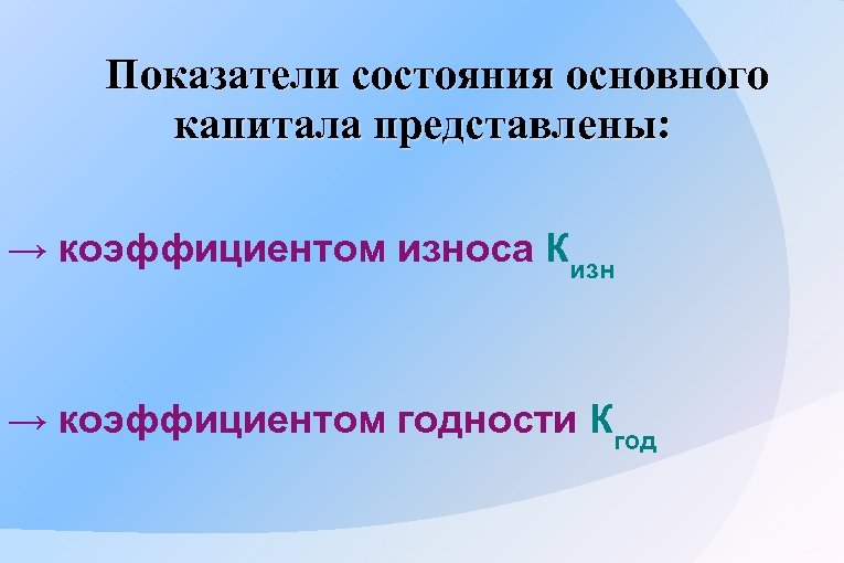 Показатели состояния основного капитала представлены: → коэффициентом износа Кизн → коэффициентом годности Кгод