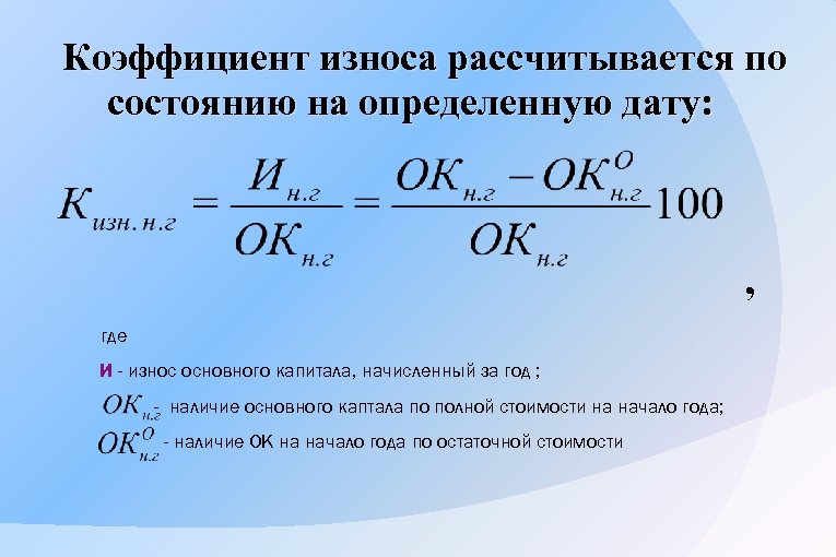 Коэффициент износа рассчитывается по состоянию на определенную дату: , где И - износ основного капитала, начисленный за год ; - наличие основного каптала по полной стоимости на начало года; - наличие OK на начало года по остаточной стоимости