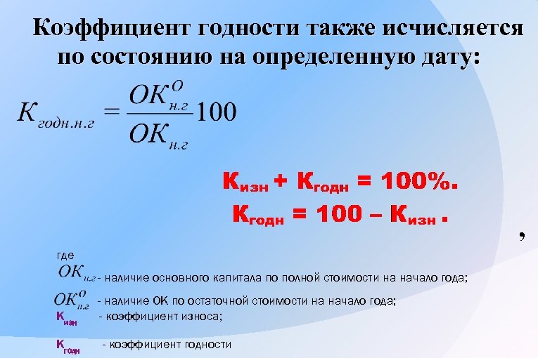 Коэффициент годности также исчисляется по состоянию на определенную дату: , где - наличие основного капитала по полной стоимости на начало года; Кизн Кгодн - наличие OK по остаточной стоимости на начало года; - коэффициент износа; - коэффициент годности