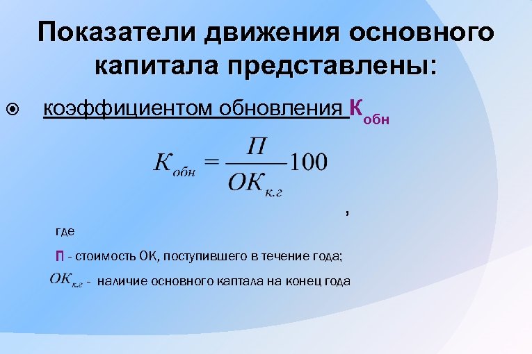 Показатели движения основного капитала представлены: коэффициентом обновления Кобн , где П - стоимость OK, поступившего в течение года; - наличие основного каптала на конец года